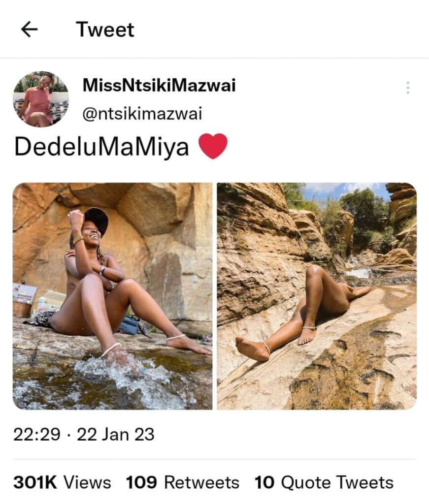 Controversial South African poet Ntsiki Mazwai has been trending on social media after she posted some n_aked pictures on Twitter.