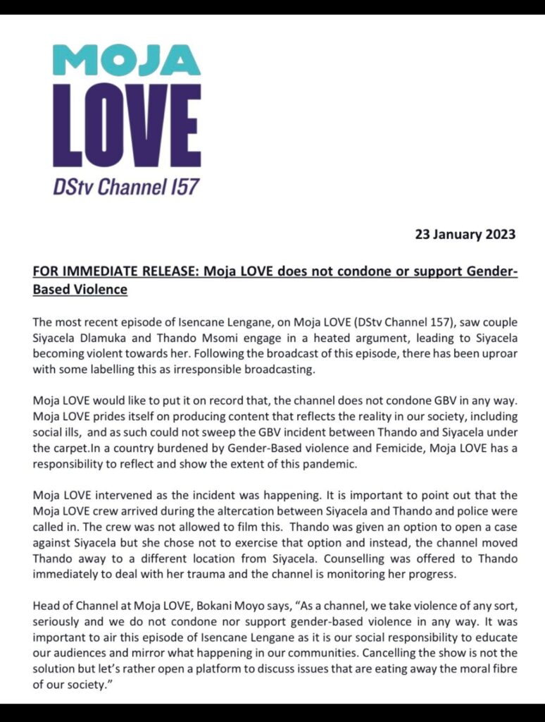 Moja Love has released a statement condemning Gender based violence that is portrayed on one of thier reality shows, Isencane Lengane.