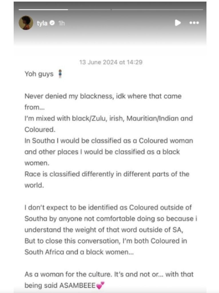 She shared an Instagram story saying, “Never denied my blackness, idk where that came from… I’m mixed with black/ Zulu, irish, mauritian/indian and coloured. In South Africa i would be classified as a coloured woman and other places i would be classified as a black woman.”