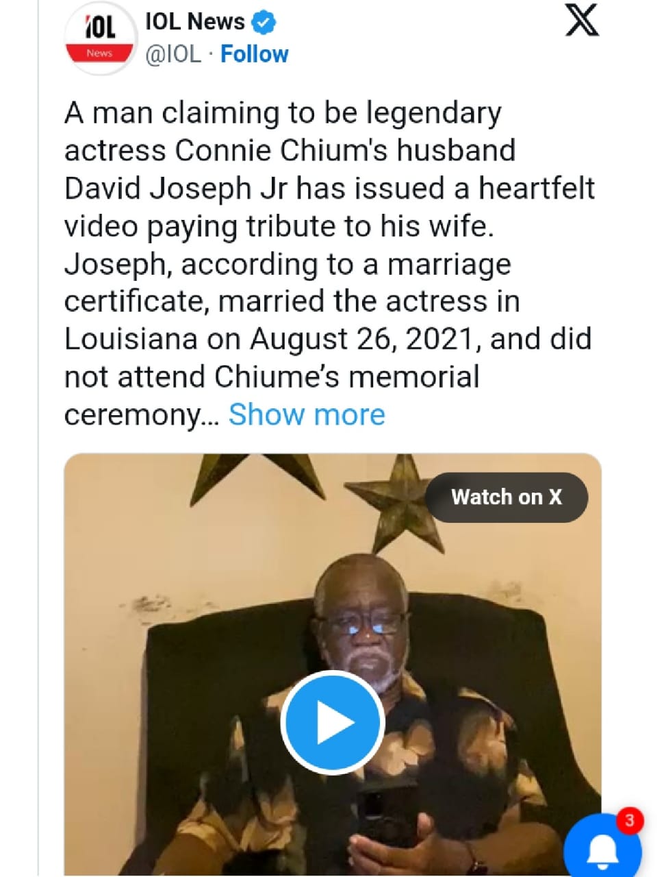 An American man claiming to be the husband of late Black Panther star Connie Chiume has paid tribute to her. David Joseph Jr paid tribute to her in a video circulating online. “Our love story started in the early 1980s is one for the books.