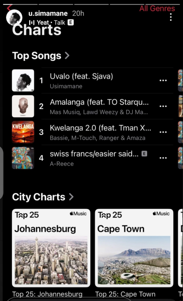 USimamane recently posted his song uvalo on his Instagram feed showing that his song is on the top chart on apple music.