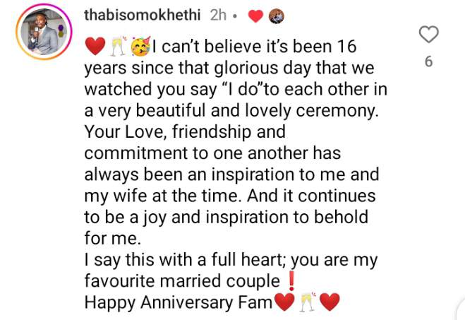 Thabiso Mokhethi took it to the comment section to say that their marriage was nothing but an inspiration to him and his wife.