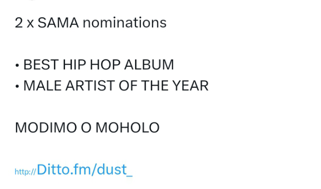 Dust was recorded last year in April and has been making waves. The artist took it to his Twitter to thank God with a caption ” Modimo O Moholo”.