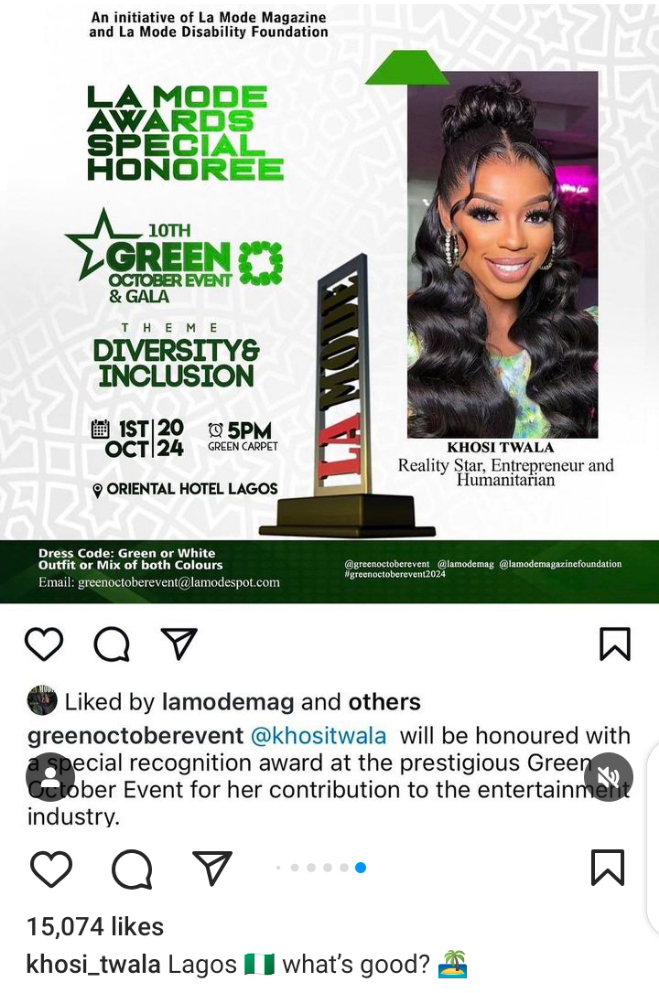 The Big brother titan winner Khosi Twala is set to receiveĀ an LAMode Award in Nigeria on 1October 2024.