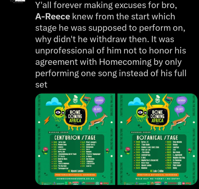 South African rapper A-Reece made an unexpected exit after only performing one song at the homecoming.