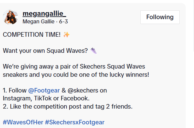 While the official Skechers 2025 Basketball Sweepstakes in the United States ran from May 19 to May 30, Meagan’s giveaway is tailored for her South African and international followers, leveraging her influence to connect fans with trendy sneaker culture. The prize—a coveted pair of Skechers Squad Waves—combines comfort and style, aligning perfectly with Meagan’s lifestyle brand collaborations, including her ongoing partnership with Forever New South Africa.