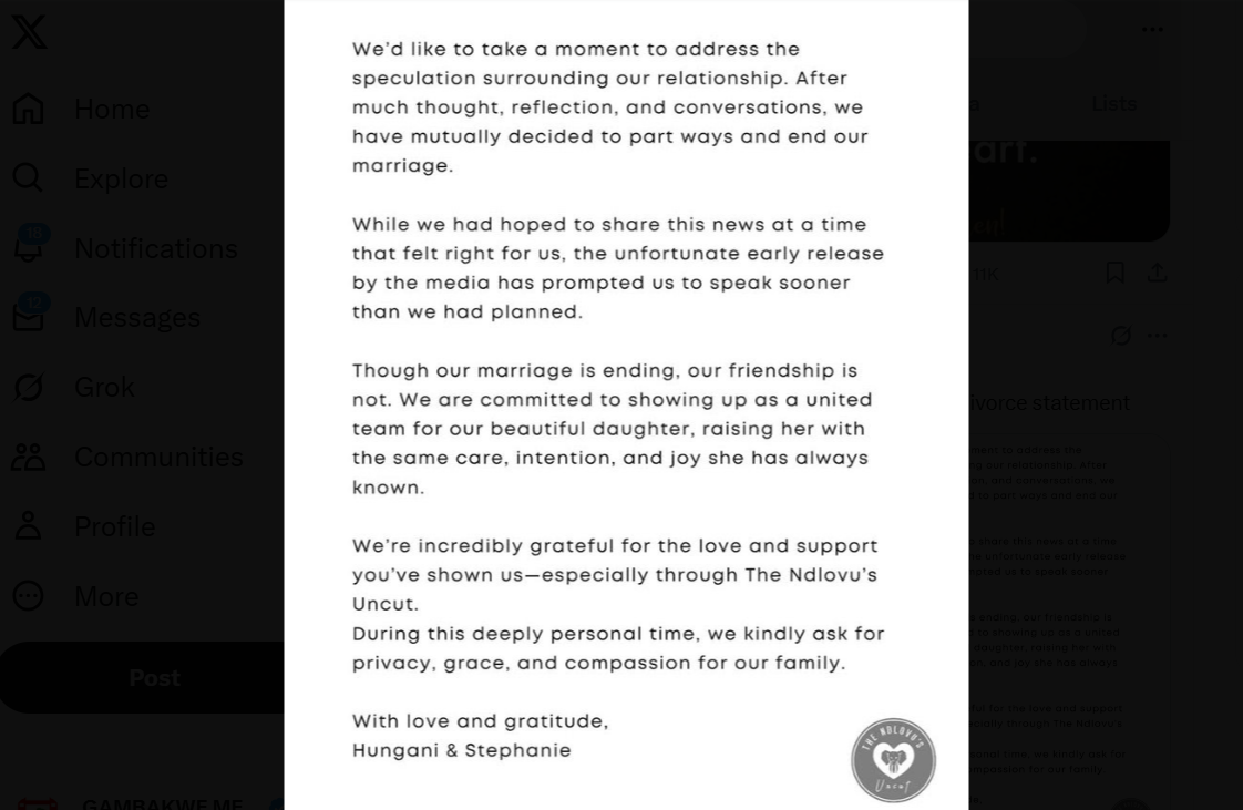 Their journey together was often celebrated publicly, including the announcement of their first child in 2022. However, reports indicate that difficulties began surfacing around late 2024, with Hungani reportedly moving out of their matrimonial home. The reasons behind their separation remain private, but the couple has emphasized an amicable split.