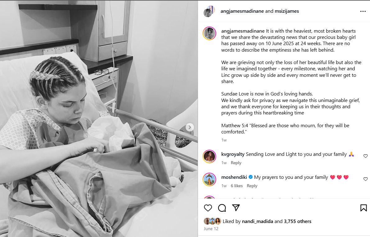 South African radio personality Msizi James (@msizijames) and his wife Angela James Madinane(@angjamesmadinane) have announced the tragic stillbirth of their unborn daughter, Sundae Love, at 24 weeks of pregnancy.