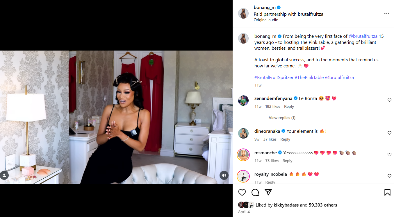 Bonang Matheba’s recent Instagram post beautifully encapsulates a remarkable journey of growth and empowerment. Reflecting on her career, Bonang shared how she began as the very first face of Brutal Fruit 15 years ago—a role that ignited her passion and set her on a path to success. Fast forward to today, she’s not only a celebrated media personality and entrepreneur but also the inspiring host of The Pink Table, a groundbreaking event by Brutal Fruit Spritzer that celebrates the power of women coming together.