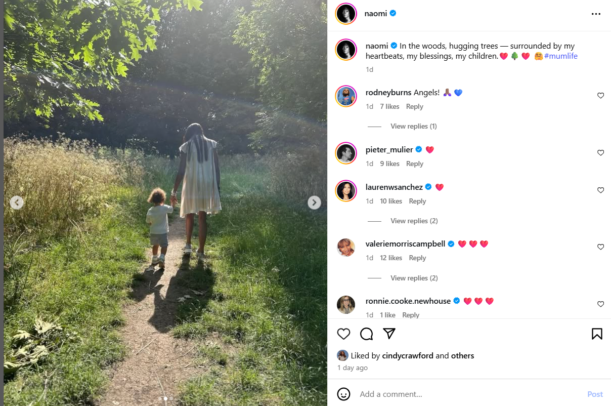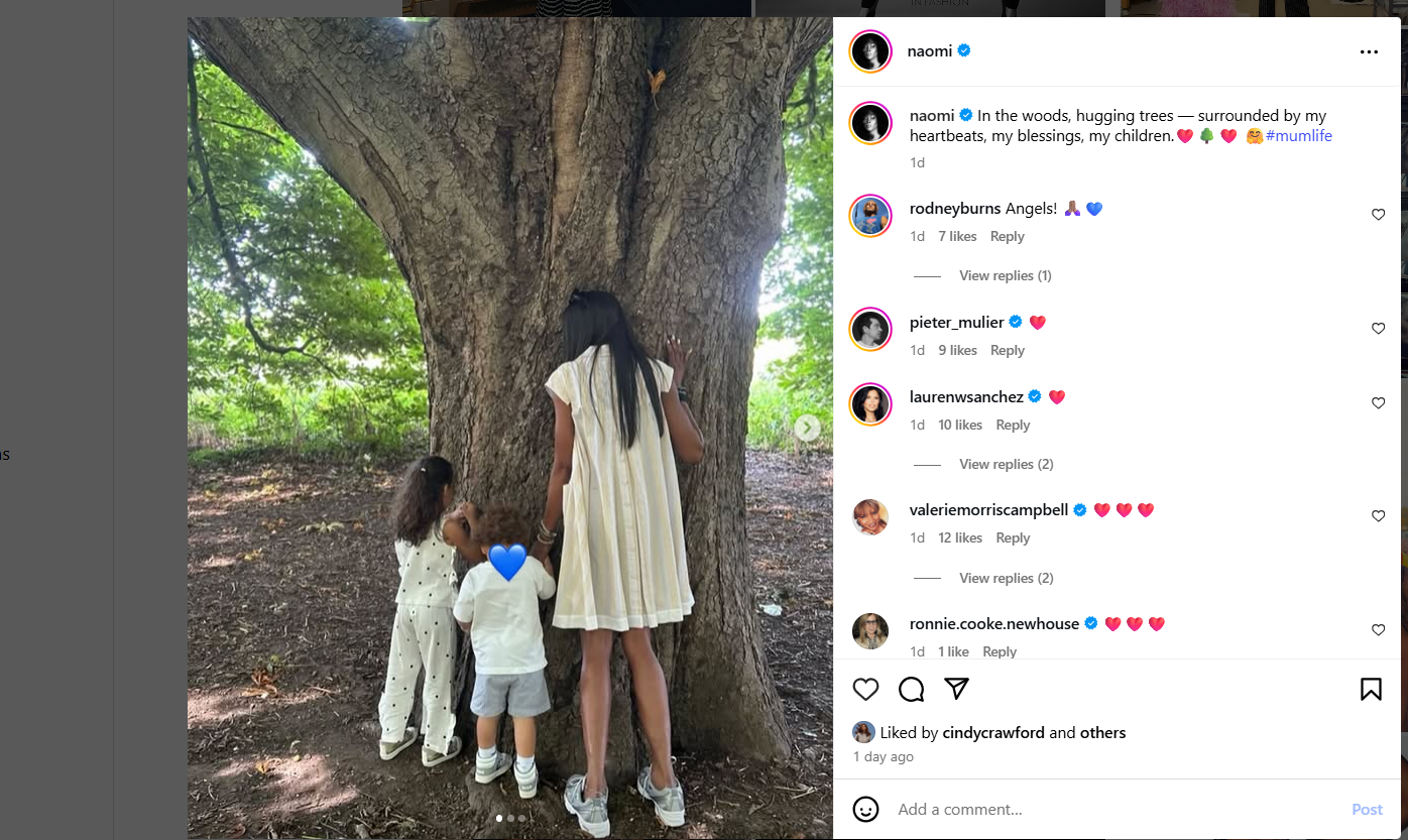 In the photos, Campbell can be seen embracing a tree and walking hand-in-hand with her 23-month-old son, dressed in a white top and shorts, while her 4-year-old daughter strolls nearby wearing a white tank top and polka-dot pants. The serene setting underscores the close bond the family shares, with Naomi captioning the post, “In the woods, hugging trees — surrounded by my heartbeats, my blessings, my children.