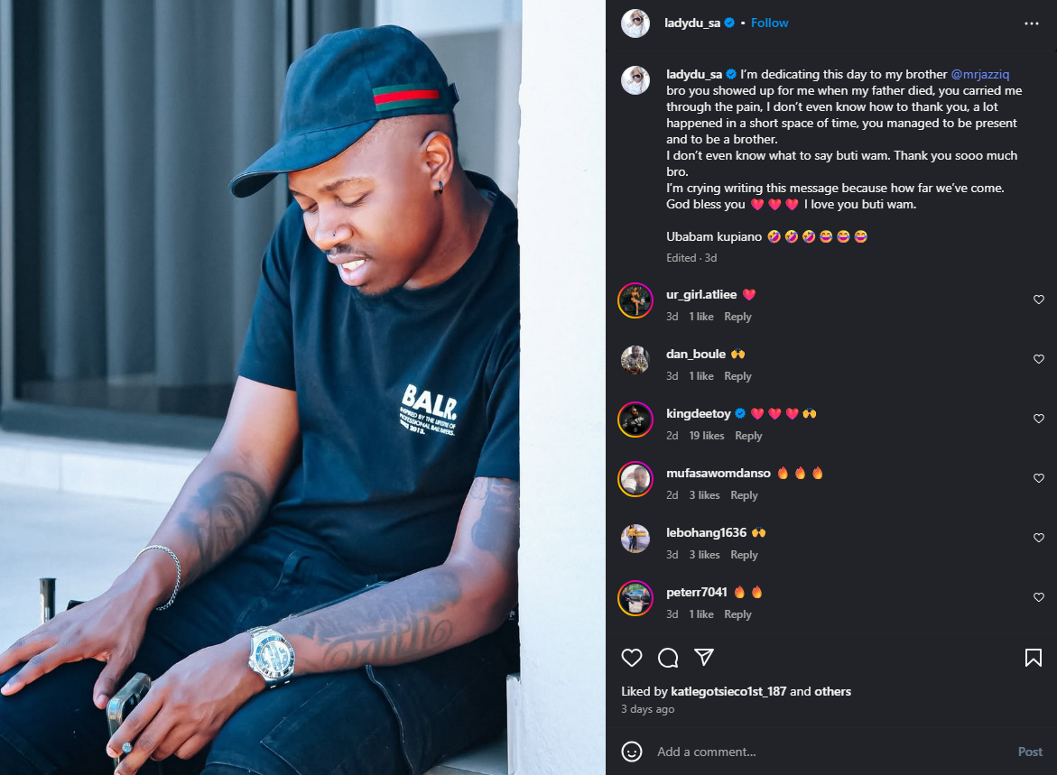 Referring to Mr JazziQ as “buti wam,” a term meaning “my brother,” Lady Du highlighted the depth of their connection, which transcends mere friendship or professional collaboration. This brotherhood has been forged not only through shared experiences of grief and healing but also through their musical journey together as pivotal figures in the rise of Amapiano. Their artistic synergy is well documented, with collaborations on hit tracks like “Woza,” alongside other Amapiano heavyweights such as Kabza De Small and Boohle, symbolizing the spirit of unity and mutual upliftment within the genre.