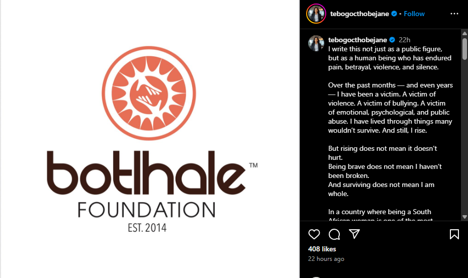 Tebogo’s journey has been anything but easy. She survived a targeted shooting, an attempt to silence her, alongside relentless online harassment and character assassination that sought to break her spirit not only as a public figure but as a mother and woman. Instead of retreating into silence, Tebogo has chosen to channel her pain into purpose. “I am a survivor,” she declared, emphasizing that her story, while deeply personal, reflects a widespread tragedy affecting countless women who suffer in silence.