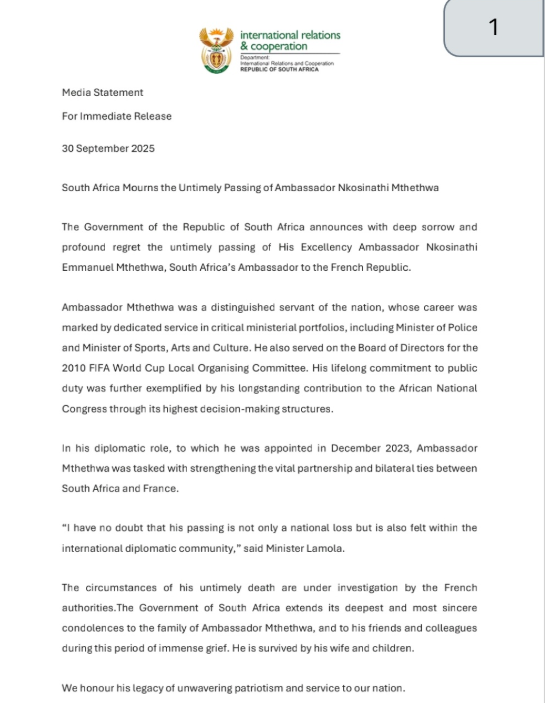 The Government of the Republic of South Africa announces with deep sorrow and profound regret the untimely passing of His Excellency Ambassador Nkosinathi Emmanuel Mthethwa, South Africa’s Ambassador to the French Republic.