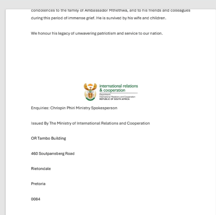 South Africa Mourns the Untimely Passing of Ambassador Nkosinathi Mthethwa