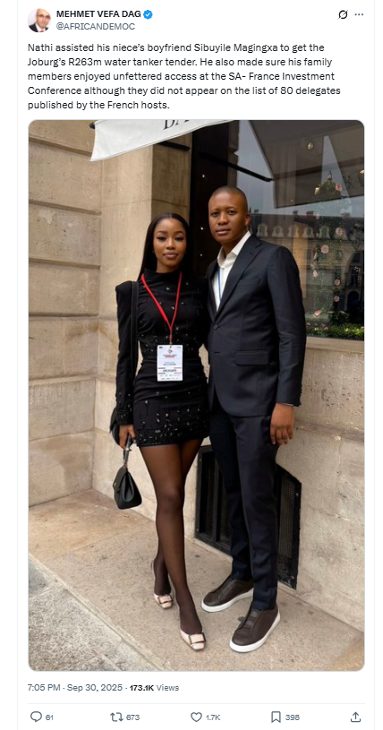 MEHMET VEFA DAG: Nathi assisted his niece’s boyfriend Sibuyile Magingxa to get the Joburg’s R263m water tanker tender. He also made sure his family members enjoyed unfettered access at the SA- France Investment Conference although they did not appear on the list of 80 delegates published by the French hosts.