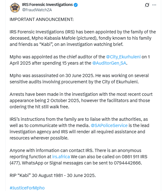 IMPORTANT ANNOUNCEMENT: IRS Forensic Investigations (IRS) has been appointed by the family of the deceased, Mpho Kabasia Mafole (pictured), fondly known to his family and friends as “Kabi,” to conduct an investigation watching brief.