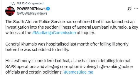 The South African Police Service has confirmed that it has launched an investigation into the sudden illness of General Dumisani Khumalo, a key witness at the #MadlangaCommission of Inquiry. General Khumalo was hospitalised last month after falling ill shortly before he was scheduled to testify. His testimony is considered critical, as he has been detailing internal SAPS operations and alleging corruption involving high-ranking police officials and certain politicians. @JamesBlac_rsa